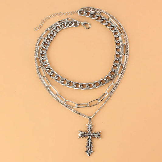 Collar Multicapa con Cruz de Cadena Gruesa - Estilo Punk