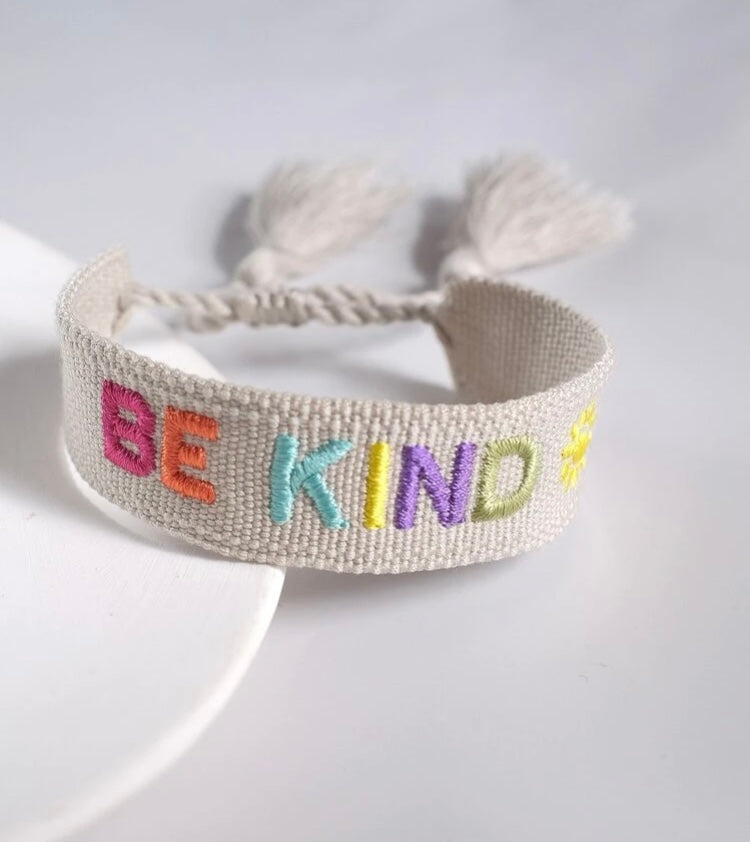 "Descubre la belleza de la bondad con nuestro brazalete tejido. Las borlas en tono beige y las letras de colores que forman la frase 'Be Kind' transmiten un mensaje poderoso.